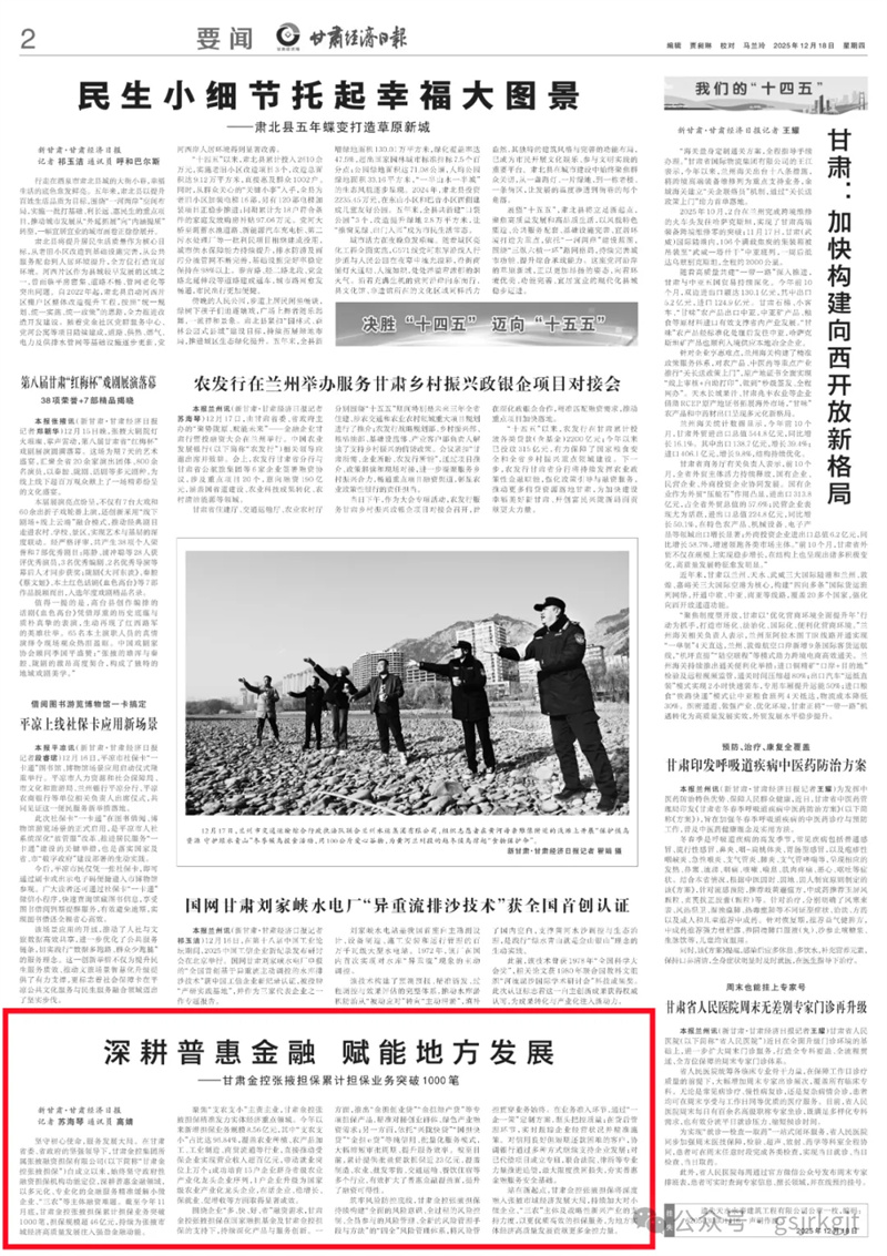(新甘肃·甘肃经济日报记者 苏海琴 通讯员 高婧)坚守初心使命,服务发展大局。在甘肃省委、省政府的坚强领导下,甘肃金控集团所属金控张掖融资担保有限公司(以下简称“甘肃金控张掖担保”)自成立以来,始终坚守政府性融资担保机构功能定位,深耕普惠金融领域,以多元化、专业化的金融服务精准缓解小微企业、“三农”等主体融资难题。截至今年11月底,甘肃金控张掖担保累计担保业务突破1000笔,担保规模超46亿元,持续为张掖市域经济高质量发展注入强劲金融动能。