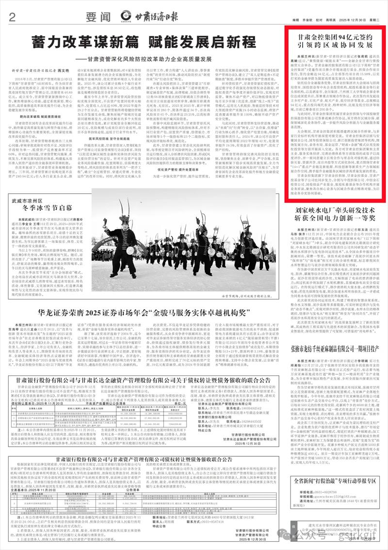 与此同时,甘肃金控集团所属甘肃金控担保与中国投融资担保股份有限公司签署战略合作协议,双方将在区域分保、联保领域深化业务协作,进一步提升风险分担能力与金融服务覆盖范围。