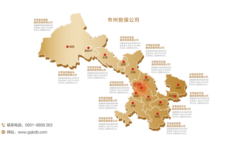 甘肃金控融资担保集团股份有限公司(简称金控担保)是由甘肃省财政厅出资,甘肃金融控股集团有限公司发起,经甘肃省地方金融管理局核准而设立的省级政府性融资担保机构,甘肃省人民政府确定的省级融资再担保机构,国家融资担保基金签约合作单位。连续四年资本市场主体信用AAA评级为稳定,连续五年荣获甘肃省“省长金融奖”,被评为甘肃省先进基层党组织、省属企业党建融入生产经营典型创建示范点、“万企兴万村”甘肃行动典型金融机构、首届“甘肃社会责任企业”。